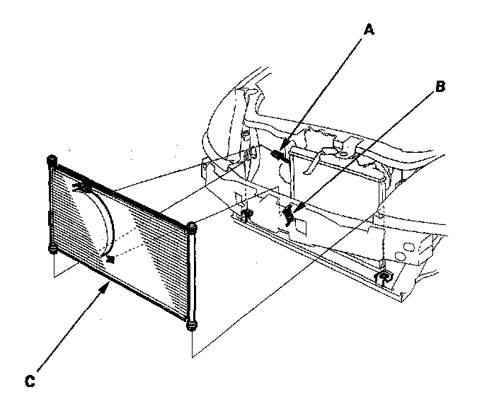6. Disconnect the condenser fan connector (A), and remove the compressor clutch connector (B) from the condenser fan shroud. Remove the condenser (C) by lifting it-up. Be careful not to damage the radiator or the condenser fins when removing the condenser.