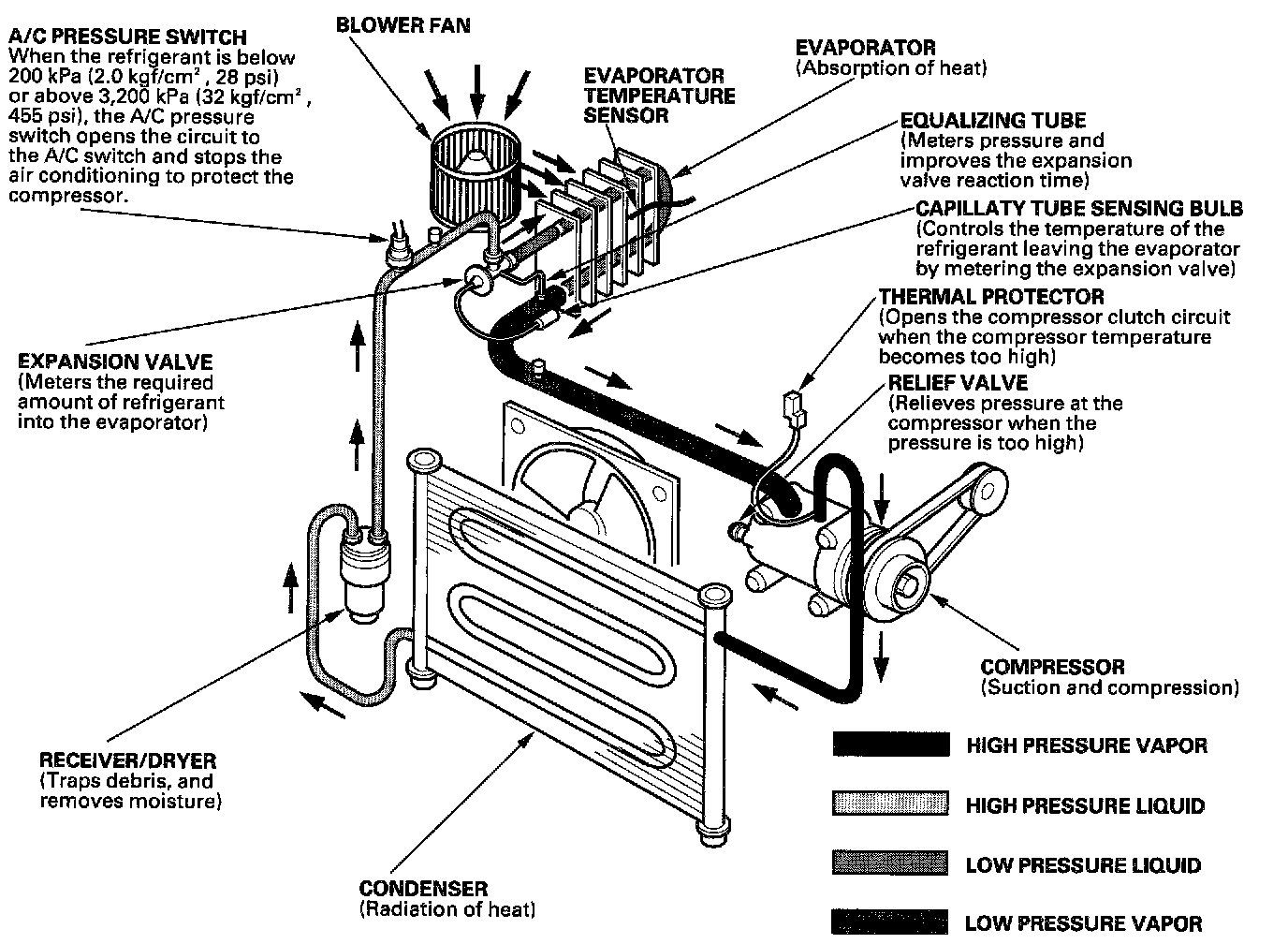 The air conditioning system removes heat from the passenger compartment by circulating refrigerant through the system as shown below.