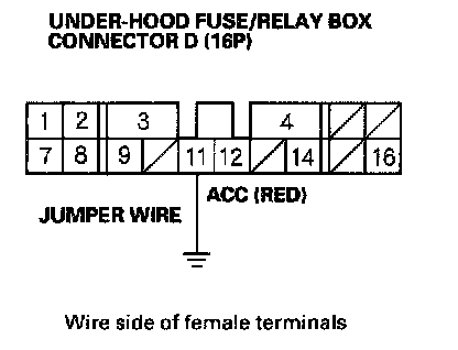 15. Momentarily connect under-hood fuse/relay box 16P connector terminal No.11 to body ground with a jumper wire several times.