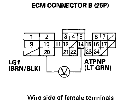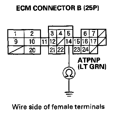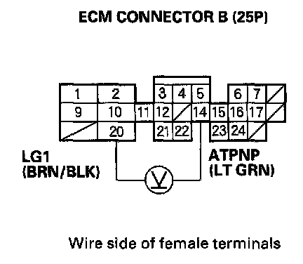 15. Measure voltage between ECM connector terminals B14 and B20 with the transmission in [N] or [P] position.