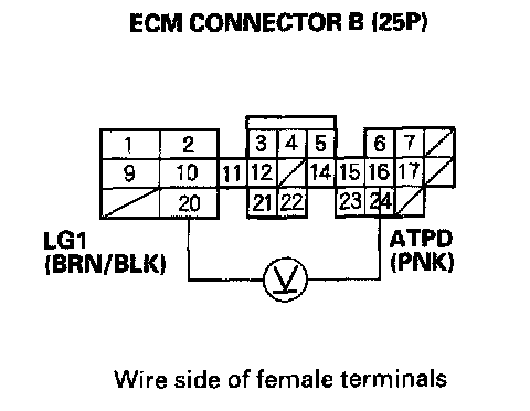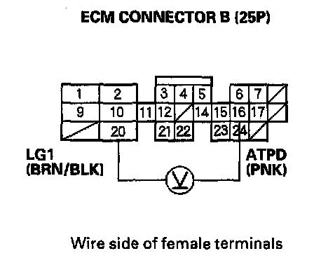19. Measure voltage between ECM connector terminals B20 and B24 with the transmission in [N] or [P] position.