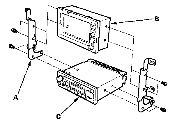 3. Remove the display unit (B) and audio unit (C) from the radio bracket.