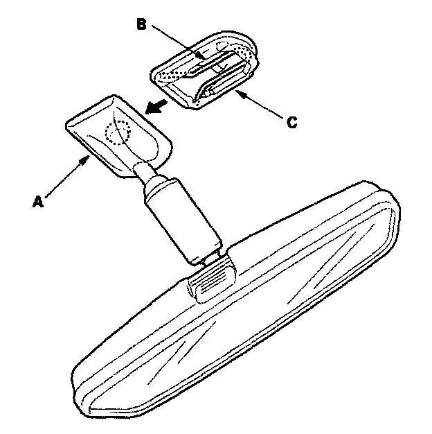 2. Slide the rearview mirror (A) down toward the bottom of the windshield to detach it from the spring (B) in the mount (C).