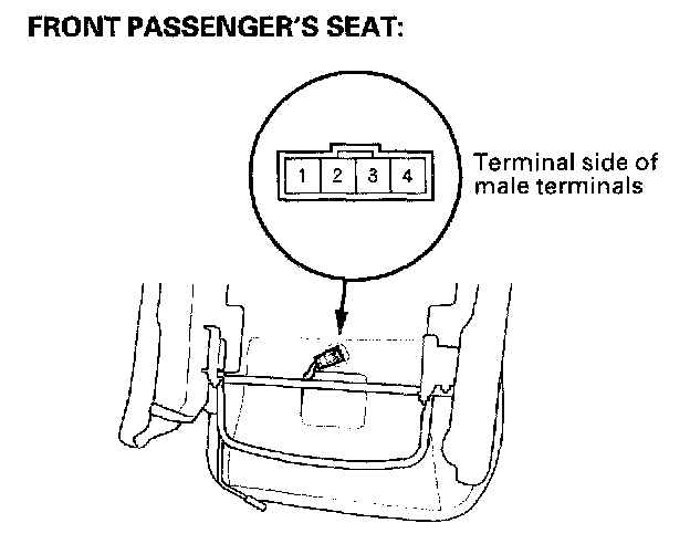 3. Front passenger's seat: Check for continuity between the No.2 and No.3 terminals, and No.3 and No.4 terminals of the passenger's seat heater connector (4P).