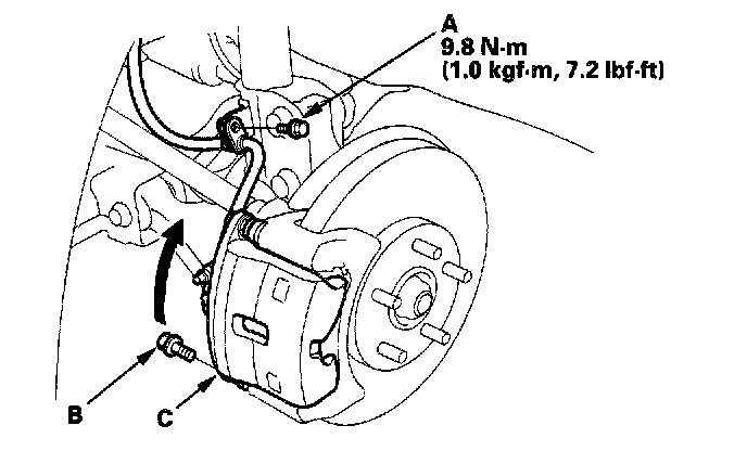 4. Pivot the caliper (C) up out of the way. Check the hoses and pin boots for damage and deterioration.