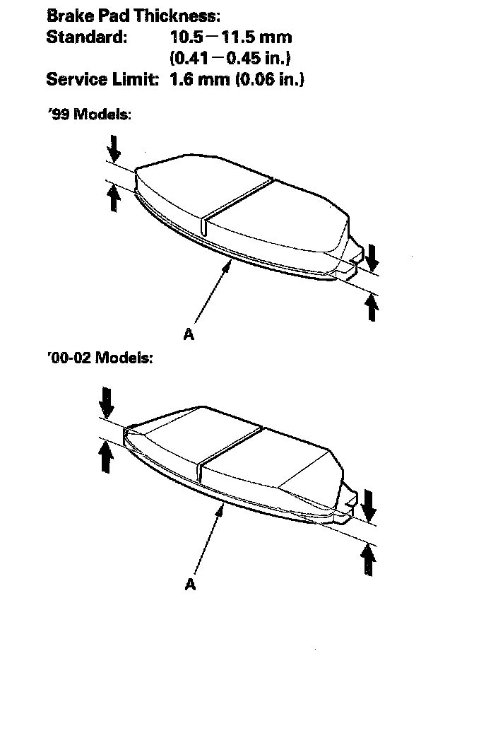 6. Using vernier calipers, measure the thickness of each brake pad lining. The measurement does not include pad backing plate (A) thickness.