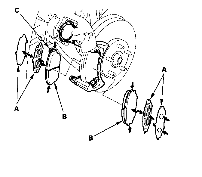 12. Install the brake pads and pad shims correctly. The '99-01 models have two pairs of the pad shims. The '02 model has one pair of the pad shims. Install the pad with the wear indicator (C) on the inside.