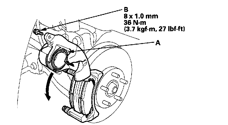 14. Pivot the caliper down into position. Hold the caliper pin with a wrench, being careful not to damage the pin boot. Install the caliper bolt (B), with another wrench, and torque it to proper specification.