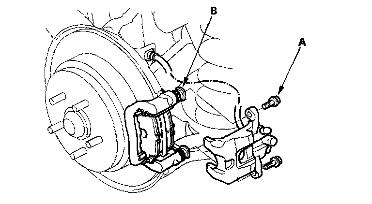 2. Remove the flange bolts (A) while holding the pins (B) with a wrench being careful not to damage the pin boot, and remove the caliper (C). Check the hose and pin boots for damage and deterioration. To prevent damage to the caliper assembly or brake hose, use a short piece of wire to hang the caliper from the undercarriage.