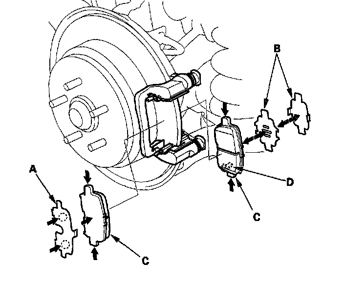9. Install the brake pads and pad shims correctly. Install the pad with the wear indicator (D) on the inside.