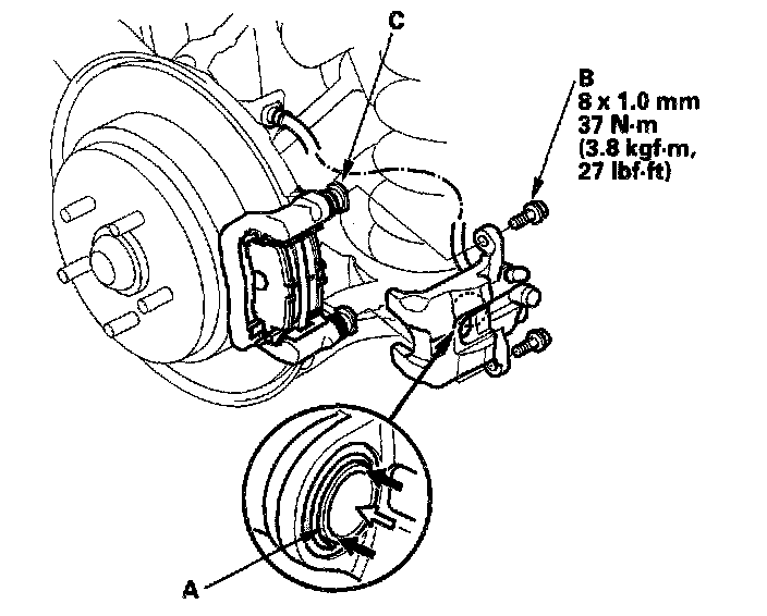 11. Install the caliper into position. Install the flange bolts (B), and torque them to the specified torque while holding the pin (C) with a wrench being careful not to damage the pin boot.