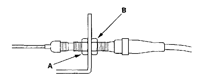 4. If the free play is not within specification, move the cable to the point where the engine speed starts to increase, and tighten the locknut (A) and adjusting nut(B).