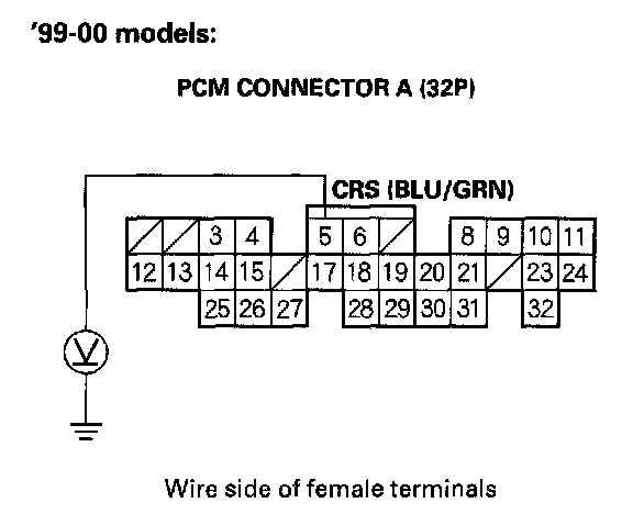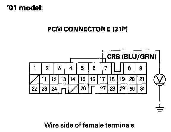 9. Connect a voltmeter between PCM connector terminal A5 ('99-00, '02-03 models) or E17 ('01 model) and body ground Drive the vehicle at speeds over 25 mph (40 km/h) with the cruise control set, and watch the voltmeter.