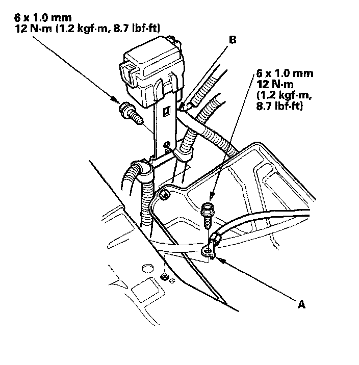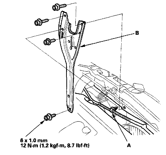 5. Remove the harness clamp (A), then remove the bulkhead bracket (B).