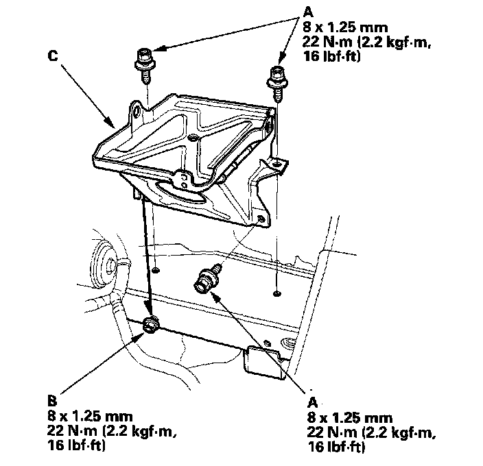 9. Remove the three mounting bolts (A) and loosen mounting bolt (B), then remove the battery base (C).