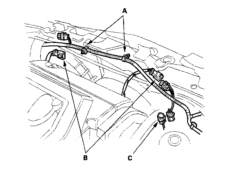 10. Remove the harness clamps (A), then remove the fan motor connectors (B) and air conditioning (A/C) compressor clutch connector (C).