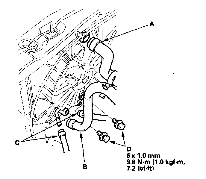 12. Remove the two bolts (D) securing the ATF cooler line.