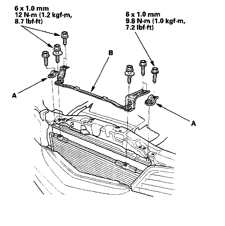 13. Remove the radiator upper brackets/cushions (A) and condenser bracket (B).