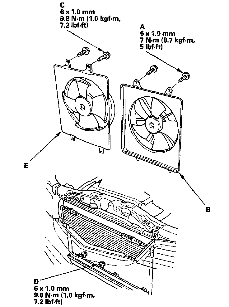 15. Remove the two bolts (c) securing the condenser fan shroud, and loosen the two bolts (D) securing the condenser fan shroud, then remove the condenser fan shroud assembly (E) from the battery side.