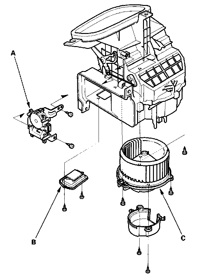 - The recirculation control motor (A), the blower resistor or power transistor (B) and the blower motor (C) can be replaced without removing the blower unit.