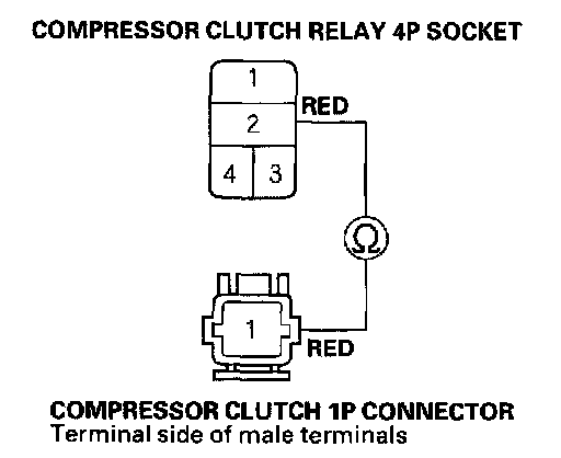 17. Check for continuity between the No.2 terminal of the compressor clutch relay 4P socket and the No.1 terminal of the compressor clutch 1P connector.