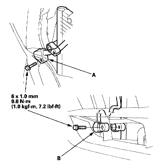 4. Remove the bolts, then disconnect the discharge line (A) and receiver line (B) from the condenser. Plug or cap the lines immediately after disconnecting them to avoid moisture and dust contamination.