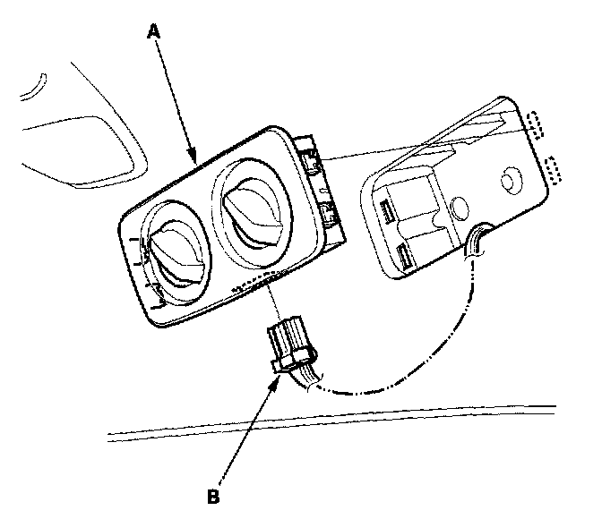 Rear Heater-A/C Passenger's Control Panel Removal and Installation1. Remove the rear heater-A/C passenger's control panel (A) from the headliner, then disconnect the 10P connector (B). Be careful not to damage the switch or the headliner.