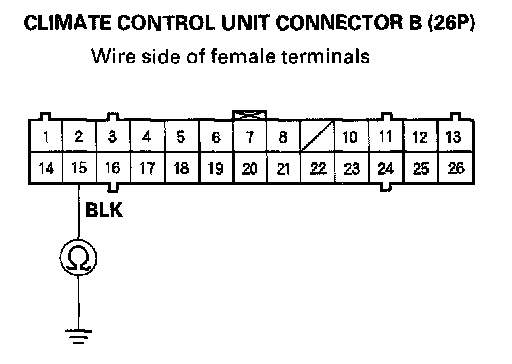 12. Check for continuity between the No.15 terminal of climate control unit connector B (26P) and body ground.