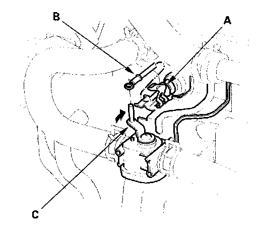 Heater Valve Cable Adjustment1. From underthe hood, open the cable clamp (A), then disconnect the heater valve cable (B) from the heater valve arm (C).