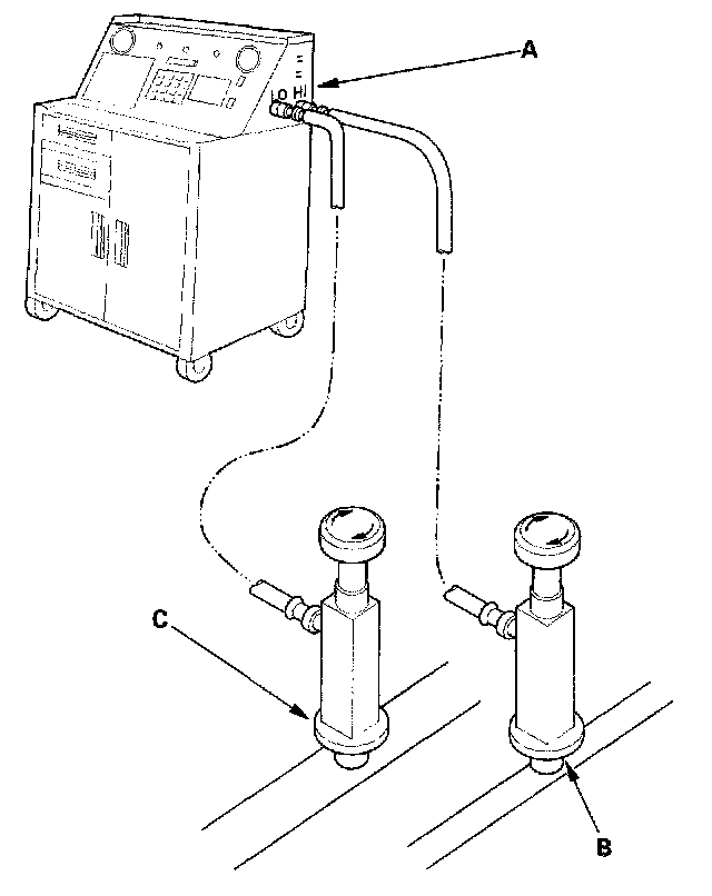 1. Connect a R-134a refrigerant recovery/recycling/charging station (A) to the high-pressure service port (B) and the low-pressure service port (C), as shown, following the equipment manufacturer's instructions.