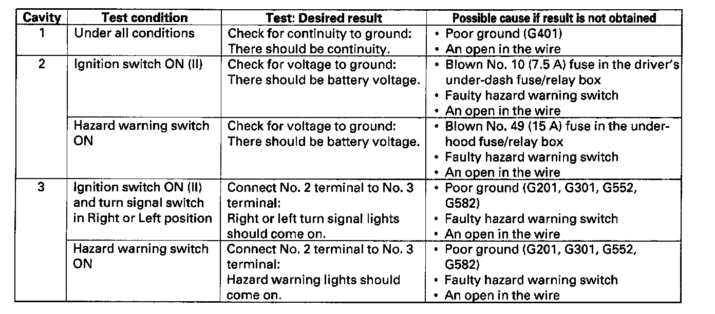 - If all the input tests prove OK, the turn signal/hazard relay must be faulty; replace it.