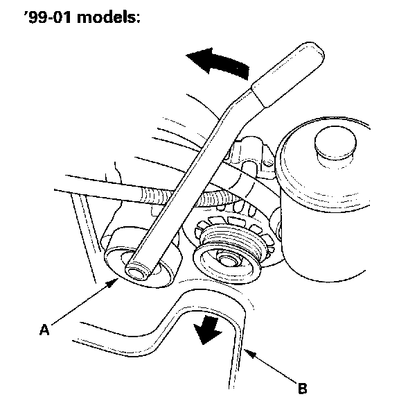 2. Move the auto-tensioner (A) to relive tension from the alternator-compressor belt (B), and remove the belt.