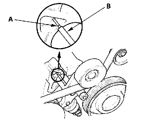 2. Check that the pointer (A) on the oil pump is not beyond the edge of the indicator rib (B) on the auto tensioner. If pointer is beyond the indicator rib replace the alternator compressor belt.