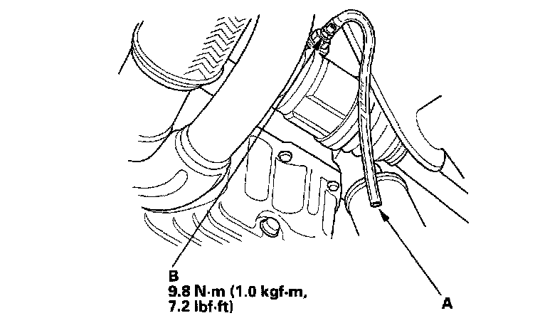 4. Install a rubber hose (A) on the drain bolt (B) located at the rear of the cylinder block, then loosen the drain bolt.