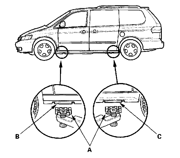 1. Position the hoist lift blocks (A), or safety stands, under the vehicle's front support points (B) and rear support points (C).
