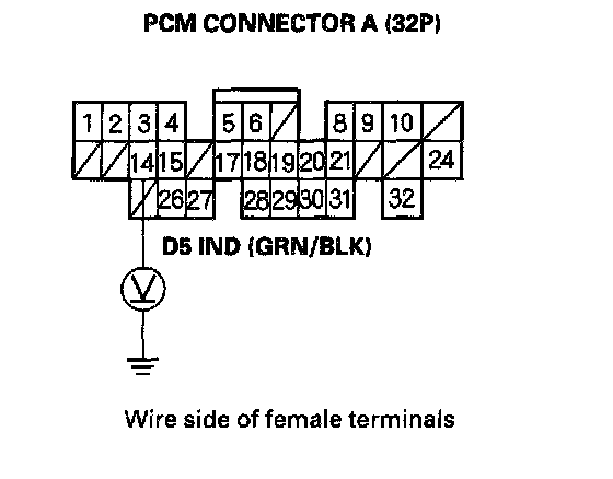 YES - Check for loose terminal fit in the PCM connector A14 and recheck the D indicator several times. If the problem is intermittent, substitute a known-good PCM and recheck. If the indicator then works OK every time, replace the original PCM.