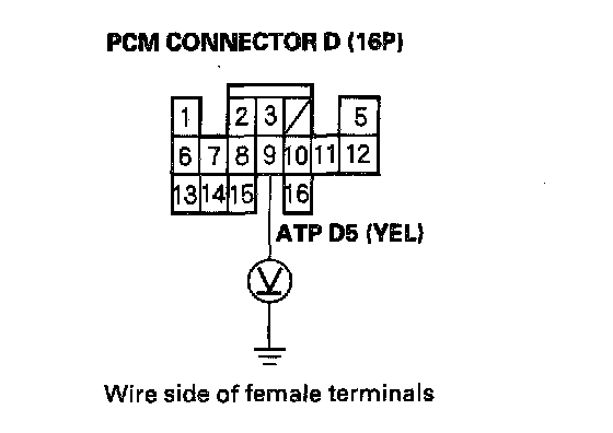 15. Measure the voltage between PCM connector terminal D9 and body ground.