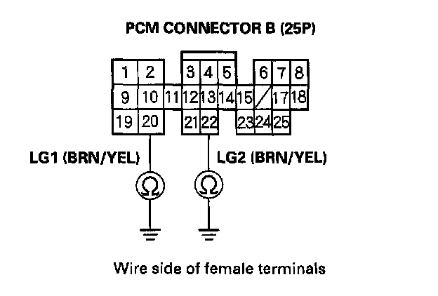 20. Check for continuity between body ground and PCM connector terminals B20 and B22.
