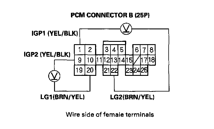 23. Measure the voltage between PCM connector terminals B1 and B22, and between B9 and B20.