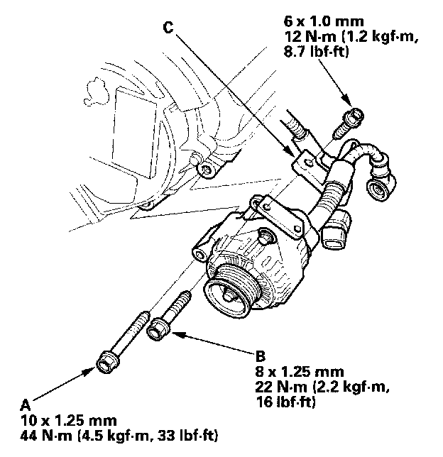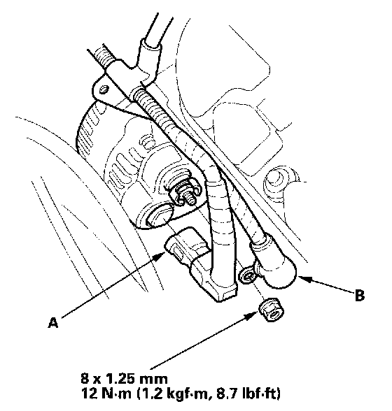 5. Remove the mounting bolt (A) and alternator bracket mounting bolt (B), then remove the harness clamp (C) from the alternator bracket.