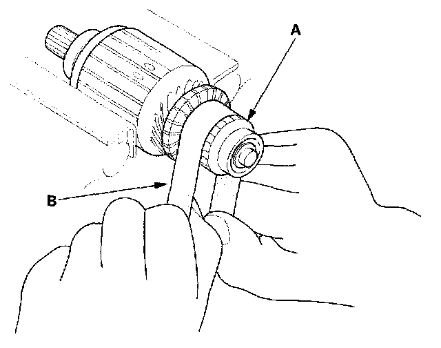 4. Check the commutator (A) surface. If the surface is dirty or burnt, resurface with emery cloth or a lathe within the given specifications, or recondition with # 500 or # 600 sandpaper (B).