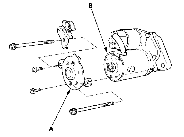 16. Install the starter end cover (A) to retain the brush holder (B).