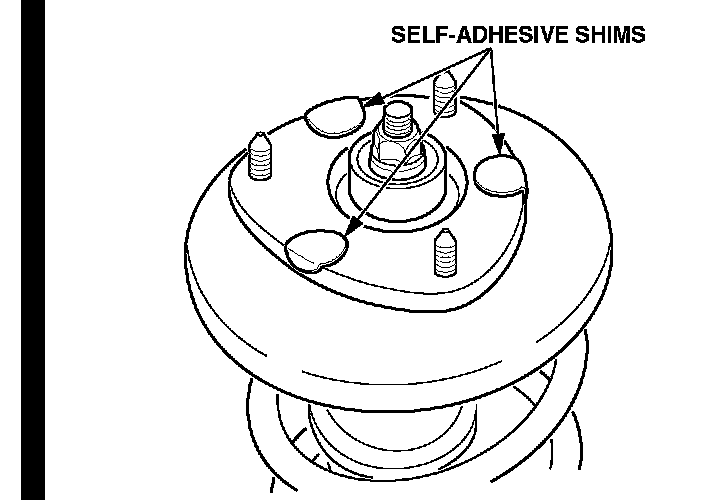 10. Install three self adhesive shims to the damper mounting base as shown. Position the shims so the edge of the shim is slightly rolled over the edge of the damper mounting base.