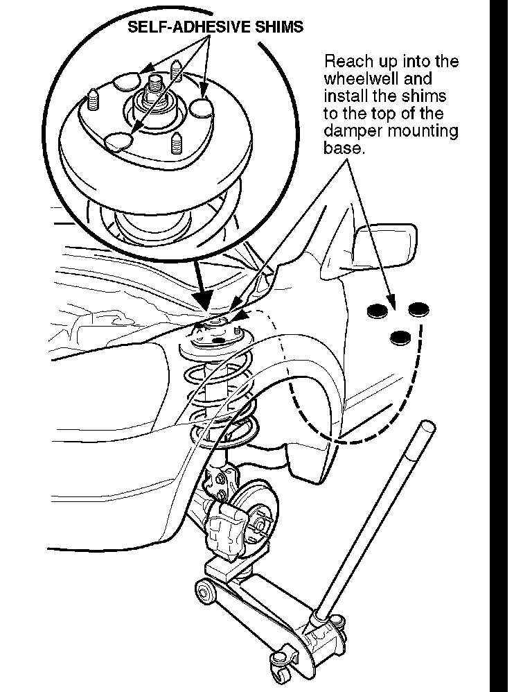 5. Install three self adhesive shims to the damper mounting base as shown. Position the shims so the edge of the shim is slightly rolled over the edge of the damper mounting base.