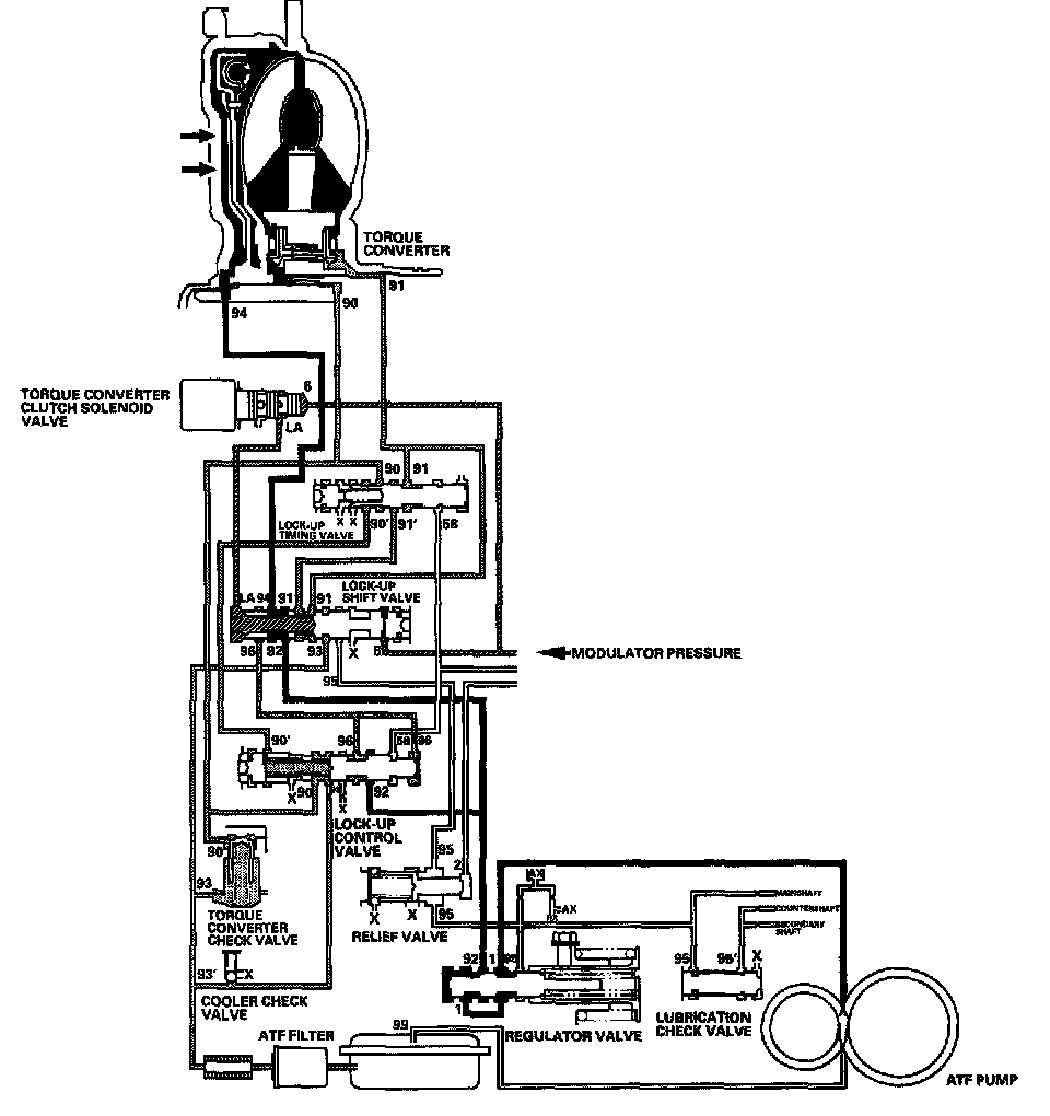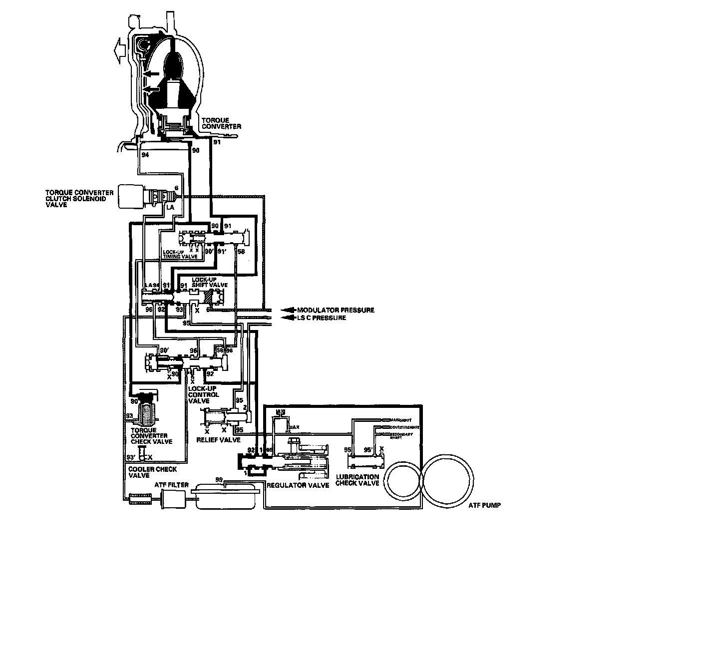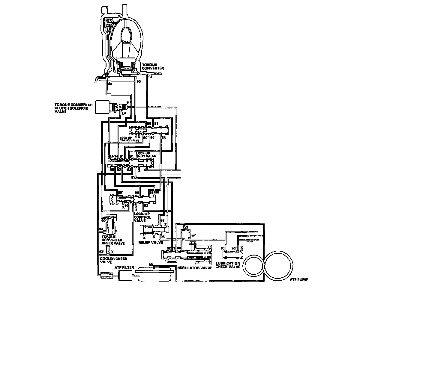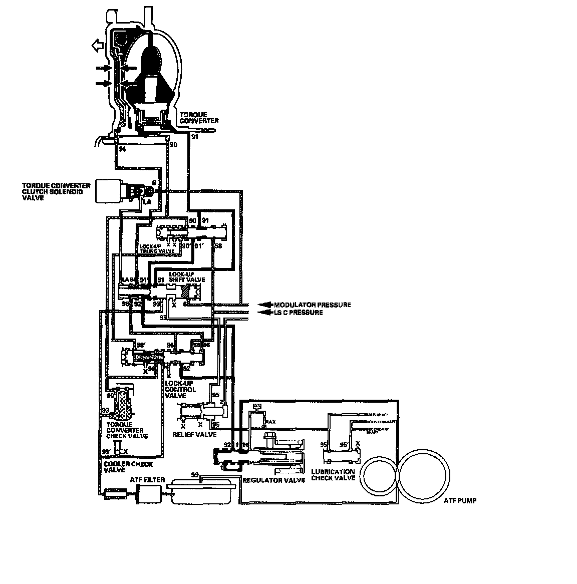 The torque converter clutch solenoid valve is turned OFF by the PCM. The lock-up shift valve receives LC pressure (LA) on the left side, and modulator pressure (6) on the right side. The lock-up shift valve is in the right side to uncover the port leading torque converter pressure (92) to the left side of the torque converter. Torque converter pressure (92) becomes torque converter pressure (94), and enters into the left side of the torque converter to disengage the lock-up clutch. The lock-up clutch is OFF.