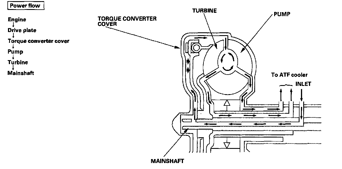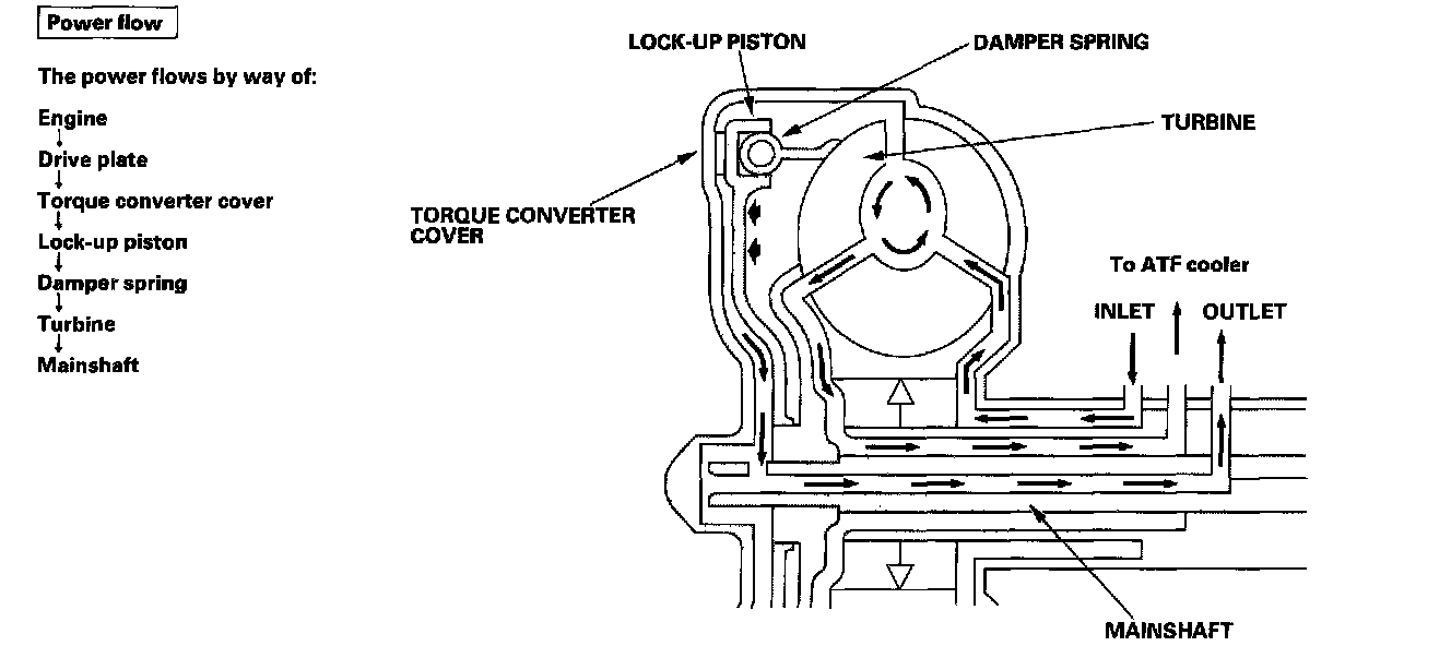 With the lock-up clutch on, fluid in the chamber between the torque converter cover and the lock-up piston is drained off, and the converter fluid exerts pressure through the piston against the torque converter cover. As a result, the converter turbine is locked to the converter cover. The effect is to bypass the converter, placing the vehicle in direct drive.