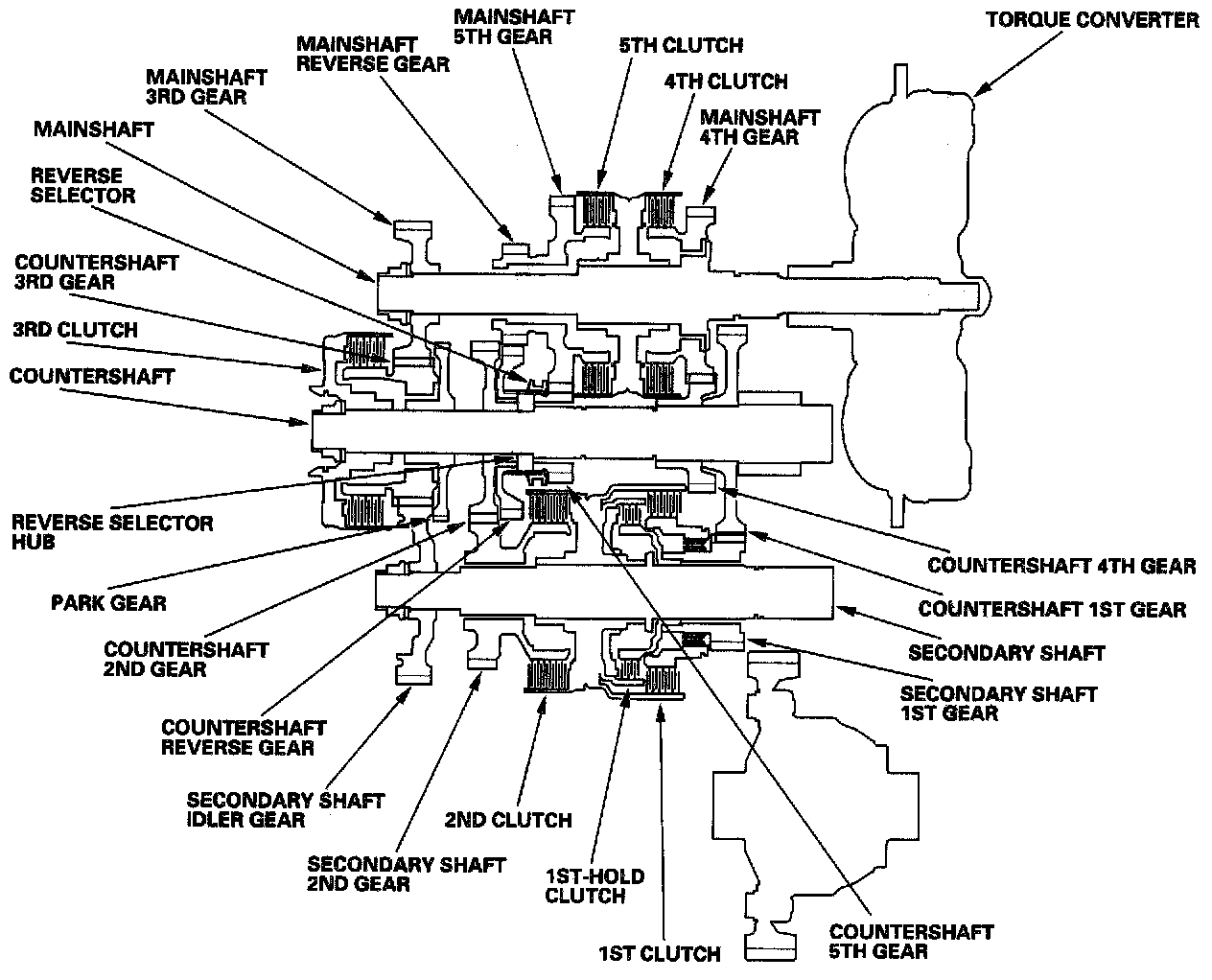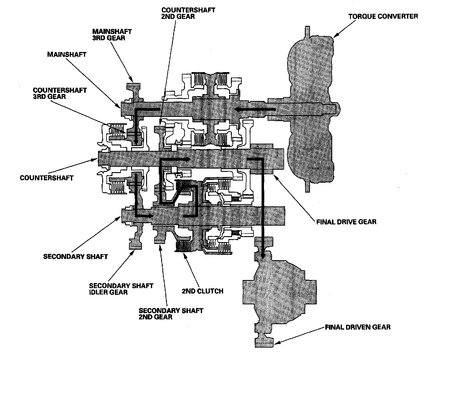 Engine power transmitted from the torque converter drives the mainshaft 3rd gear, the countershaft 3rd gear, and the secondary shaft idler gear, but hydraulic pressure is not applied to the clutches. Power is not transmitted to the countershaft. The countershaft 5th gear is engaged with the reverse selector hub and the countershaft by the reverse selector, when the shift lever is shifted in the N position from the forward range (D, D3, 2, 1 positions). The countershaft reverse gear is engaged when shifted from the R position.