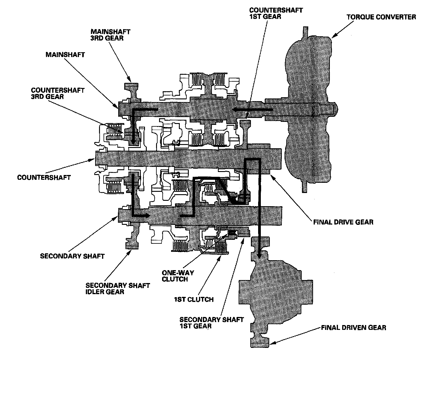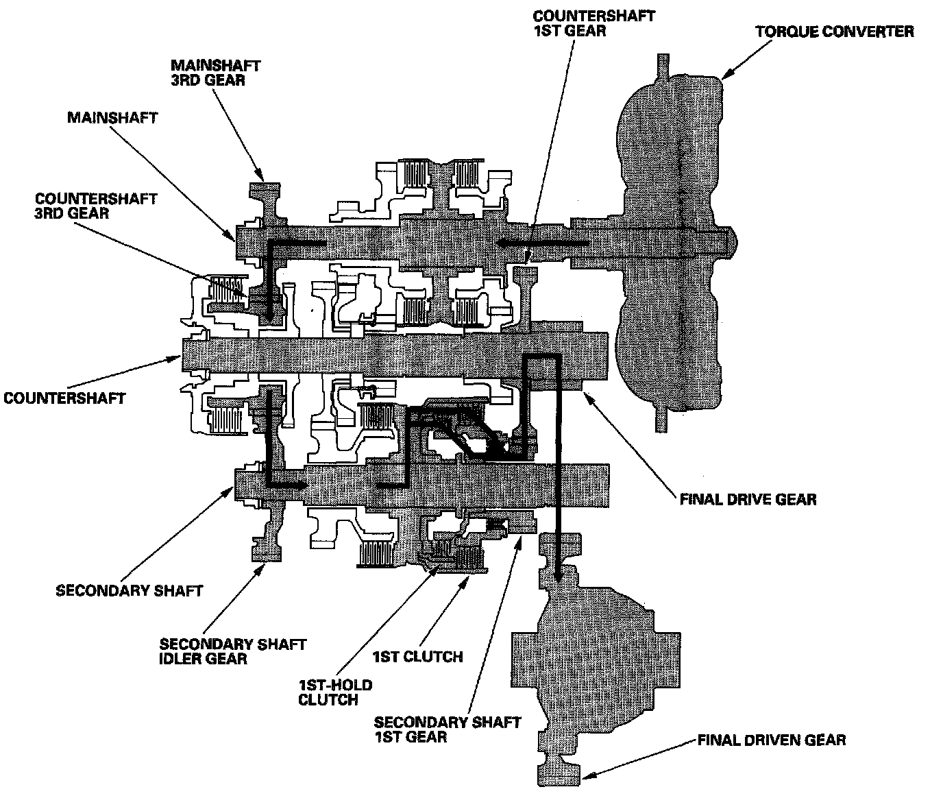 ^ Hydraulic pressure is applied to the 1st clutch and the 1st-hold clutch. Rolling resistance from the road surface goes through the front wheels to the final drive gear, then to the secondary shaft idler gear.