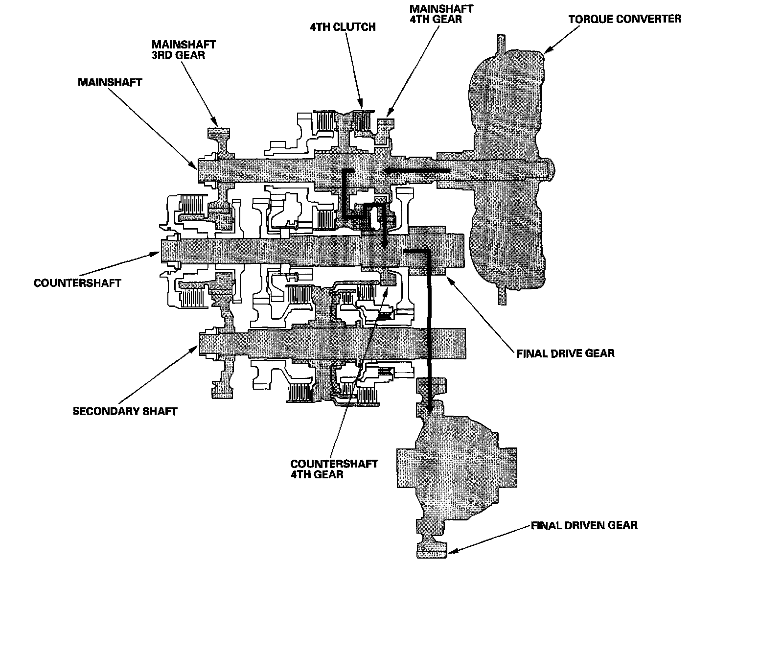 ^ Hydraulic pressure is applied to the 4th clutch, then the 4th clutch engage the mainshaft 4th gear with the mainshaft.