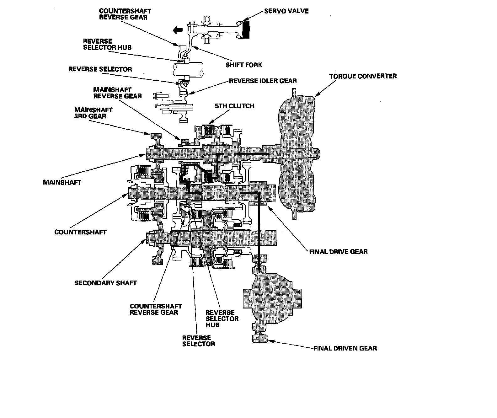 ^ Hydraulic pressure is applied to the servo valve to engage the reverse selector with the countershaft 5th gear while the shift lever is in the forward range (D, D3, 2 and 1 position).